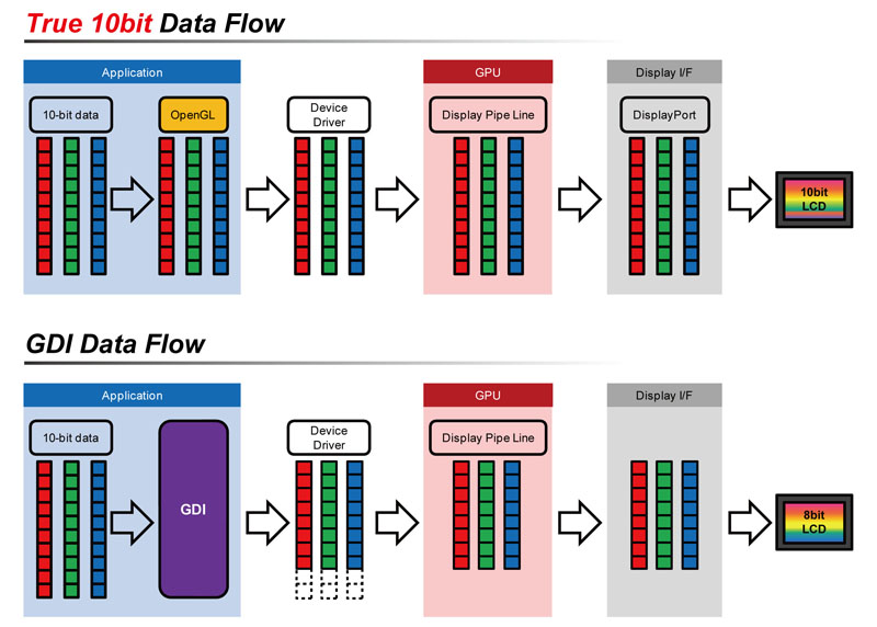 「True 10bit Data Flow」では、GPU(AMD FireProシリーズ)内部でも10bitで処理されていることがわかる。